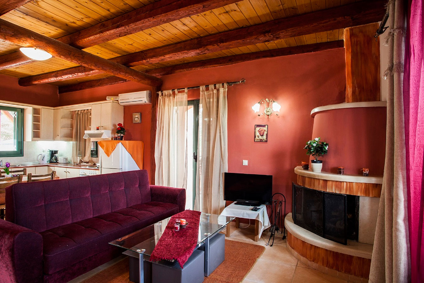 Στο καθιστικό υπάρχει τζάκι το οποίο θα σας προσφέρει μια ξεχωριστή αίσθηση και συντροφιά, ειδικά τις βροχερές ή κρύες βραδιές, δορυφορική τηλεόραση και DVD-Player.